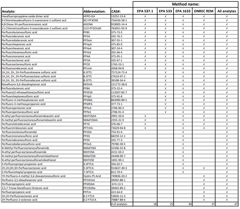 A total of 29 Unique per- and polyfluoroalkyl substances (PFAS) can be effectively measured by method 537.1 and 533.See EPA Table Here